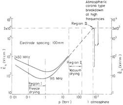 Die Konstruktion und der Bau von Mikrowellen Gefriertrocknern ist anspruchsvoll, weil bei Designfehlern des Trockners später Plasma auftreten kann. Grundsätzlich tritt Plasma auf, wenn die elektrische Feldstärke in der Vakuumkammer die Durchbruchfeldstärke überschreitet. Ionisierung der in der Vakuumkammer entstehenden Gase führt zu Plasmabögen, welche Verbrennungen an der Produktoberfläche verursachen können. Das Auftreten dieses Phänomens bedeutet erhebliche Energieverluste und Überhitzung von trockenen Produktbereichen, wodurch das Endprodukt stark beschädigt wird (Arsem and Ma, 1985; Goudl and Kenyon, 1971). Der Grenzwert der Durchbruchfeldstärke ist abhängig vom Vakuum. Das Minimum liegt in dem Vakuumdruckbereich, der für Gefriertrocknungsprozesse verwendet wird (siehe Bild 2). Um das Auftreten der Plasmabögen zu verhindern ist es daher nötig, die Prozessparameter Kammerdruck und Mikrowellenleistung zusammen mit einer guten Ankopplung des Mikrowellen Generators an die Vakuumkammer mit dem Produkt zu optimieren. Auch ist die konstruktive Ausführung der Vakuumkammer wichtig (Duan et al, 2010), um Plasmaentzündungen zu vermeiden.