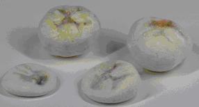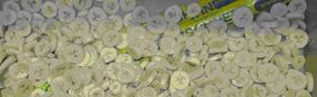 Für Bananen gibt es eine große Nachfrage, hauptsächlich als Zusätze für Müsli und auch für Snacks. Das Materialhandling für Bananenscheiben ist schwierig, da sie mechanisch extrem instabil sind und schnell oxidieren. Im gefrorenen Zustand jedoch lassen sie sich gut handhaben und sind auch mechanisch ausreichend stabil für eine Mikrowellen Gefriertrocknung in der Trommel (siehe Bild 15). Es läßt sich auch eine Kombinationstrocknung aus Mikrowellen-Gefriertrocknung in der Hauptrocknung bei 1mbar und eine Mikrowellen Vakuum Endtrocknung bei 20mbar realisieren. In der Vakuumtrockung bei 20mbar läßt sich durch hohen Mikrowellenenergieeintrag ein Puffing erzielen, in dem sich das Produktvolumen um den Faktor 2-5 vergrößern läßt (siehe Bild 16)