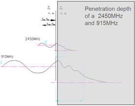 Die Mikrowellenfrequenz von 915MHz wird hauptsächlich für große industrielle Installationen verwendet, da wirtschaftliche Magnetrons von 30kW bis zu 100kW verfügbar sind. Auch haben 915MHz eine ungefähr 2.7x größere Eindringtiefe als 2450MHz (siehe Bild 4).