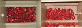Bild 12. 3kg ganze gefrorene Früchte (oben) und Mikrowellen gefriergetrocknete Himbeeren (unten) in einer offenen Trommel