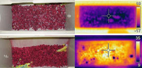 Wie auf Bild 10 zu erkennen, haben Stellen mit punktuellen Eisstücken oder mit einem höheren Feuchtegehalt innerhalb des Volumens der Erdbeere einen Einfluss auf den Mikrowellen Gefriertrocknungsprozess und die Produktqualität. Aufgrund der ungleichmäßigen Verteilung des elektromagnetischen Feldes und wegen Unterschieden der Produktbeschaffenheit, können Teile der Erdbeere höhere Energiedichten absorbieren als andere und entsprechend höhere Temperaturen annehmen. Wenn die Produkttemperatur den Siedepunkt von -5°C überschreitet, erhöhen sich die dielektrischen Verluste des gefrorenen Wassers erheblich. Dadurch steigt die Temperatur stark an und das Wasser im Produkt geht in die Flüssigkeitsphase über. Dadurch wird punktuell extrem viel Mikrowellen Energie absorbiert. Das Wasser verdampft direkt im Produktvolumen und verursacht Blasen, welche die ursprüngliche Textur des Produktes zerstören.