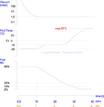 Die durchschnittliche Verweildauer in der konventionellen Gefriertrocknung liegt zwischen 20-60 Stunden, je nach Art und Menge der zu trocknenden Früchte oder Gemüsesorten. Dazu steigt in der Regel in der letzten Trocknungsphase die Produkttemperatur über 0°C, da durch die geringe Restfeuchte im Produkt die Verdampfungstemperatur ihren Einfluß auf die Produkttemperatur verliert. Temperaturen von 0°C bis 50°C können auftreten. Bei langer Verweildauer in der Endtrocknung im konventionellen Gefriertrocknungsverfahren, wird das Produkt stundenlang diesen erhöhten Temperaturen ausgesetzt. Dabei lässt die Wärmeleitfähigkeit des Produktes stark nach, so dass der Wärmeeintrag in das Produktvolumen entsprechend länger dauert. Dieses stellt insbesondere bei ganzen Früchten wie Erdbeeren, Himbeeren, Blaubeeren ein großes Problem dar. In einer langen Trocknungsphase mit zu hohen Temperaturen werden auch Inhaltsstoffe wie Aromen, Vitamine und Antioxidatien angegriffen und zerstört. Das Endprodukt mag noch sehr gute Texturen aufweisen und gut zu rehydrieren sein, hat jedoch einen Großteil seiner Vitamine, Antioxidantien und Aromen verloren. Dagegen ist das Produkt bei der Mikrowellen Gefriertrocknung mit einer Verweildauer von nur einigen Stunden weitaus kürzere Zeit Temperaturen von über 20°C ausgesetzt, so dass Vitamine, Antioxidantien und Aromen weitestgehend erhalten bleiben.