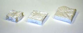 Am Beispiel der Erdbeeren ist dieser Effekt auf Bild 10 gut zu sehen. Daraus ergibt sich die Forderung, dass Produkteigenschaften wie Größe, Form und gefrorener Zustand einheitlich sein müssen, und dass die Mikrowellenenergie möglichst gleichmäßig in das Produkt einkoppelt. Deshalb muß das Produkt während der Trocknung bewegt werden, so dass eine gleichmäßige Energieaufnahme der einzelnen Produkte garantiert ist. Auch die Tiefe des Vakuums spielt eine wichtige Rolle. Je niedriger das Vakuum, desto sicherer kann der Prozess, aufgrund des Sicherheitsabstandes zur kritischen Temperatur von -5°C, verlaufen. Natürlich ist ein tiefes Vakuum grundsätzlich mit hohen Kosten verbunden. Hier gilt es einen sinnvollen Kompromiss zu finden. Während die oben genannten Temperaturen für normales Leitungswasser gelten, sollte außerdem beachtet werden, dass auch der Zuckeranteil großen Einfluss hat und die Siedetemperatur erhöht. Um Produkte mit hohen BRIX Werten zu beherrschen, sollte das Vakuum (unter Berücksichtigung der Wirtschaftlichkeit) so tief wie möglich sein (Mageean et al, 1991). Kritisch ist auch die Außenhaut als Membran mit beschränkter Durchlässigkeit. Der Stoffübergang durch diese Membran ist begrenzt, und sie beschränkt damit den Austritt von Feuchte und den Stofftransport. Um dieses zu vermeiden, können die Erdbeeren an der Außenhaut perforiert werden, um einen besseren Stofftransport mit höherer Trockenrate zu erreichen. Bild 11 zeigt die Textur der inneren Teile nach der Mikrowellen Gefriertrocknung. Die Beispiele auf Bild 10 wurden unter 1mbar Vakuumdruck in 2 Stunden getrocknet, die Beispiele auf Bild 11 in 5 Stunden mit 0,5bar.