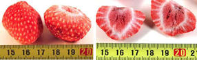Bild 11. Ganze Mikrowellen gefriergetrocknete Erdbeeren (links), nach dem Trocknen durchgeschnitten um die innere Textur und Struktur zu zeigen (rechts).