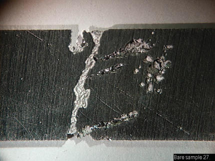 Abbildung 6a: Testcoupon des ASTM G48 B Test. Ein stark korrodierter unbeschichteter Coupon.