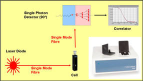 Ein modernes DLS-Instrument ist mit einem kompakten Diodenlaser und einer hochwertigen Faseroptik, einer so genannte Singlen Mode Fiber (SMF) Optik, ausgestattet (Abb.1). Die patentierte SMF-Optik ist die wesentliche Grundlage für eine hohe Sensitivität moderner Geräte. Diese Instrumente messen in sehr kurzen Zeitabständen die Streulichtintensität einer Probe und korrelieren die Messwerte miteinander. Durch die unterschiedlich schnellen Bewegungen von großen und kleinen Makromolekülen entsteht eine definierte Korrelationsfunktion aus der über einen mathematischen Fit der Diffusionskoeffizient D der gelösten Makromoleküle bestimmt werden kann. Aus diesem wiederum kann der hydrodynamische Radius Rh der gelösten Probe ermittelt werden: