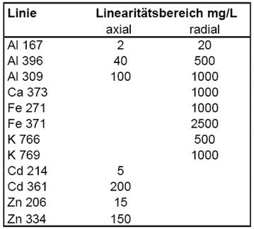 | Tab. 3: Linearitätsbereiche ausgewählter Linien in axialer und radialen Plasmabetrachtung mit dem iCAP 6000 DUO. |