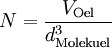 VersuchsaufbauAuf eine mit Wasser gefüllte Schale wird eine feine Schicht Bärlappsporen gepudert. Diese dienen dazu, die Wasseroberfläche besser sichtbar zu machen. Anschließend wird ein Tropfen eines Gemischs aus Ölsäure und Petrolether oder Leichtbenzin mit bekannter Konzentration und zuvor bestimmtem Volumen in die Mitte der Schale gegeben. Die chemische Formel der Ölsäure muss ebenfalls bekannt sein. Der Petrolether oder das Leichtbenzin dienen der Verdünnung der Ölsäure, die sich so besser in sehr kleinen Mengen dosieren lässt, und einer gleichmäßigen schnellen Verteilung der Ölsäure auf dem Wasser. Der Petrolether oder das Leichtbenzin verdunstet sofort, weshalb auf dem Wasser ein Fleck aus reiner Ölsäure entsteht. Dieser verdrängt die Bärlappsporen kreisförmig an den Rand der Schale, weshalb er deutlich sichtbar ist und mit einem Lineal vermessen werden kann. Im Idealfall entsteht ein perfekter Kreis, meist „zerfranst“ aber der Rand. AuswertungVon grundlegender Bedeutung ist die Annahme, dass es sich bei dem Ölfleck um eine monomolekulare Schicht handelt, das heißt, dass sich nicht mehrere Moleküle übereinander befinden. Dies kann man durch einfache Zusatzversuche belegen. Gibt man einen weiteren, gleich großen Öltropfen hinzu, verdoppelt sich der Flächeninhalt genau. Zudem ist es nicht möglich, den Fleck zu vergrößern, etwa durch blasen. Berechnung der MolekülgrößeEinen möglichst runden Fleck kann man nun als Zylinder betrachten, wobei der Durchmesser eines Moleküls der Höhe des Zylinders entspricht. Über das Volumen des Tropfens und die Konzentration der Petrolether(Benzin)-Ölsäure kann man nun das Volumen der reinen Ölsäure ausrechnen, das mit dem des Zylinders identisch ist. Mit dem abgemessenen Radius kann man nun die Höhe des Zylinders berechnen. Dadurch hat man bereits die Größe eines Ölsäuremoleküls. Berechnung der AtomgrößeIn der einfachsten Form der Berechnung geht man von würfelförmigen Molekülen und Atomen aus. Da man nun die Kantenlänge kennt, kann man wiederum das Volumen eines Moleküls berechnen. Aus der chemischen Formel der Ölsäure kann man erkennen, aus wie vielen Atomen ein Molekül besteht. Man geht nun davon aus, dass alle Atome gleich groß sind und das Volumen des Moleküls vollständig ausfüllen. Teilt man also das Volumen eines Moleküls durch die Anzahl der Atome, erhält man das Volumen eines Atoms. Da man wieder eine Würfelform verwendet, kann man den Durchmesser eines Atoms berechnen. Je nach Genauigkeit der Durchführung erhält man einen Atomradius von etwa 10 − 10 Metern, angesichts der Einfachheit des Versuchs ein sehr genauer Wert. Berechnung der AvogadrozahlDa man nun die Kantenlänge eines Moleküls kennt, kann man die Anzahl an Molekülen im Ölfleck ausrechnen, indem man das Volumen des Öls durch das Volumen eines Moleküls dividiert. Über die Definition der Avogadrozahl weiß man, dass sich die Anzahl der Moleküle des Ölflecks zur Avogadrozahl so verhält wie die Masse des Öls im Ölfleck zu der Masse eines Mols Öl (Molare Masse oder Molmasse), welche man aus der chemischen Formel und den Angaben des Periodensystems entnehmen kann. Auch das Ergebnis der Avogadrozahl liegt in der richtigen Größenordnung, je nach Versuch etwa zwischen Mathematischer AnsatzKlärung der FormelzeichenBekannte oder gemessene Größen: