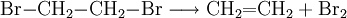 DehalogenierungAls dritte mögliche β-Eliminierung gibt es die Dehalogenierung von 1,2-Dihalogenalkanen. Dabei wird in Alkoholen während der Anwesenheit von Zink zwei gleichartige Halogenatome in β-Stellung eliminiert. Dabei entsteht das Alken und das Halogen in atomarer Form: