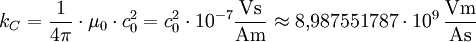 Hierbei ist Weiter ist der Vektor der Feldstärke des von der Ladung q1 erzeugten elektrischen Feldes im Abstand r vom Mittelpunkt. Die Konstante wird auch als Coulomb-Konstante bezeichnet. Es gilt: Im Gaußschen und elektrostatischen CGS-Einheitensystem wird das Coulomb-Gesetz zur Definition der elektrischen Ladung benutzt. Eine Ladungseinheit wirkt auf eine zweite im Abstand 1 cm mit der Kraft 1 dyn. Die elektrische Basiseinheit der Einheitensysteme SI, CGS-ESU und CGS-EMU unterscheidet sich prinzipiell nur durch die Festlegung von µ0: