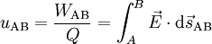 Wenn das elektrische Feld ein Potentialfeld ist (vgl. konservatives System), so ist die Arbeit, die auf dem Weg zwischen zwei Orten an einer Ladung verrichtet wird, wegunabhängig. Das Formelzeichen für das Potential ist Die Spannung uAB des Punktes A bezüglich des Punktes B ist gleich dem Integral des elektrischen Feldes über den Weg zwischen diesen beiden Punkten (Potentialdifferenz). Diese Beziehung gilt für alle elektrischen Felder, sowohl für Wirbelfelder als auch für wirbelfreie (Potential-) Felder. Bei Wirbelfeldern hängt die Spannung vom Weg ab. Ein Potential ist damit vom Widerstand und vom Strom unabhängig, während die Potentialdifferenz, die durch den fließenden Strom durch einen Widerstand hervorgerufen wird, als Spannungsabfall bezeichnet wird. Mathematische Beschreibung
