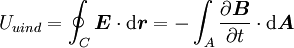 Durch Summation aller infinitesimalen Spannungen längs der Leiterschleife ergibt sich die zwischen den Punkten rA und rB induzierte Spannung: Zieht man nun gedanklich die beiden Punkte rA und rB zusammen, so strebt die in der geschlossenen Leiterschleife mit der Kontur C (rA = rB) induzierten Spannung zu der induzierten Umlaufspannung Uuind: Der dritte Ausdruck ist die gleichwertige vektorielle Darstellung des tangentialen Feldstärkeanteils mit Hilfe des Skalarproduktes. Das Integral stellt ein so genanntes Ringintegral dar und soll kennzeichnen, dass über einen kompletten Umlauf entlang der Schleife C integriert wird. Die Umlaufspannung Uuind ist ident mit der bei Transformatorberechnungen verwendeten Windungsspannung welche die induzierte Spannung für eine Windung angibt. Die praktische Bedeutung der Umlaufspannung liegt darin, dass sich mit ihrer Hilfe die in Windungen von elektrischen Maschinen induzierten Spannungen berechnen lassen. Die Umlaufspannung ist der zeitlichen Änderungsrate des magnetischen Flusses direkt proportional und somit auch ein Maß für die Wirbelstärke des elektrischen Wirbelfeldes. Das negative Vorzeichen in obiger Gleichung ergibt sich aus der Lenzschen Regel: Die induzierte Feldstärke ist immer so gerichtet, dass eine von ihr bewirkte Stromänderung bzw. zugehörige Magnetfeldänderung der verursachenden Strom- bzw. Magnetfeldänderung entgegen wirkt. Da sich Flüsse nicht einzelnen Raumpunkten sondern nur Flächen A zuordnen lassen, drückt man den magnetischen Fluss meist durch die entsprechende magnetische Flussdichte B aus: so dass sich das Induktionsgesetz in der üblichen integralen Form schreiben lässt als: Für ruhende Leiter lässt sich die Reihenfolge der Integration bzw. Differentation vertauschen. Geschlossene elektrische Wirbelfelder existieren bei zeitlich veränderlichen magnetischen Flüssen nicht nur entlang der Leiterschleife sondern beispielsweise auch im Inneren des Eisenkernes eines Transformators. Sie sind dort die Ursache der meist unerwünschten Wirbelströme und der so genannten Wirbelstromverluste. Induktionsgesetz in DifferentialformDer Übergang von der Integralform in die Differentialform ist nichts anderes als die Überführung der globalen Wirbel- und Quellenstärken in lokale, diskrete Wirbel- bzw. Quellendichten welche einzelnen Raumpunkten (Punkten eines Vektorfeldes) zugeordnet sind. In der Integralform sind es dimensionsbehaftete Zahlenwerte wie der magnetische Fluss, in der Differentialform des Induktionsgesetzes wird der Übergang auf Funktionen im Bezug zur Funktionentheorie vollzogen. Ausgegangen wird vom globalen Induktionsgesetz für ruhende Körper, wobei die Einschränkung auf ruhende Körper im folgenden wesentlich ist: Wird nun die Fläche der Kontur C in jener Gleichung laufend verkleinert, man lässt sie gegen Null streben um einen Punkt zu erhalten, strebt auch die zugehörige Wirbelstärke gegen Null. Ein Ausweg besteht darin, vor dem Übergang ein Verhältnis der Wirbelstärke mit der zugeordneten berandeten Fläche zu bilden und im weiteren mit diesem Verhältnis zu arbeiten. Der Wert dieses Punktes bleibt dann endlich und ist eine charakteristische Eigenschaft des betrachteten Feldpunktes, womit die lokale Form gebildet ist. Mathematisch wird dieser Weg dahin beschritten, dass obige Gleichung in Relation (Verhältnis) mit einem vektoriellen Flächenelement A′, dessen Normalenvektor n in Flussrichtung zeigt, gesetzt wird, und dann eine Grenzwertbestimmung für A′ → 0 erfolgt. Damit entfällt die Integration durch das Flächenintegral: Die dabei auftretende, und zunächst kompliziert wirkende Abfolge von links beginnend mit Integration, gefolgt von der Division und Grenzwertbildung, drückt man in der Vektoranalysis zusammengefasst als speziellen Vektoroperator mit der Bezeichnung rot (für Rotation, engl. curl) aus, womit die differentielle Darstellung des Induktionsgesetzes die Form: annimmt. Die lokale Wirbeldichte rot E des elektrischen Feldes E ist somit gleich der negativen zeitlichen Änderung der lokalen magnetischen Flussdichte B. Für die praktische Anwendung ist wichtig, dass sich die Vektoroperationen wie rot auf ein bestimmtes Koordinatensystem beziehen. Dies wurde in obiger Gleichung implizit durch den Normalenvektor von A′ vorweggenommen. Je nach frei wählbaren Koordinatensystem ergeben sich für die Vektoroperation verschiedene Darstellungen. Anwendung auf verschiedene GeometrienDas Induktionsgesetz beschreibt das Auftreten der Induktion bei verschiedenen Geometrien: