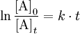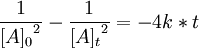 Reaktionen zweiter OrdnungIn diesem Falle reagieren zwei Edukte zu einem oder mehreren Produkten (Edukte und Produkte werden gemeinsam als Reaktanden bezeichnet). Die Reaktionsgeschwindigkeit ist abhängig von den Konzentrationen der Ausgangsstoffe. oder bei nur einem Stoff integriert wobei