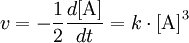 man beachte, dass der Faktor 1/2 von der stöchiometrischen Gleichung 2A = A2 kommt und nicht von der Elementarreaktion (währenddessen aber der Exponent 3 von der stöchiometrischen Gleichung herrührt).