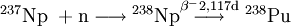 Die angegebenen Zeiten sind Halbwertszeiten. Das so gewonnene Plutonium 238Pu enthält auch schwerere Plutoniumisotope. Außerdem werden einige der Neptunium Atome auch von Neutronen über 6,27 MeV Energie getroffen, wodurch in geringer Menge auch 236Pu entsteht. Dieses zerfällt über die Thorium-Reihe, in der der starke Gammastrahler Thallium 208Tl vorkommt, weshalb 236Pu freies 238Pu, z.B. für Herzschrittmacher, über den Umweg der wenig ergiebigen und deshalb teuren Erbrütung von Curium 242Cm, produziert wird. Dieses entsteht durch einen Neutroneneinfang von 241Am, das wiederum aus 241Pu gewonnen wird. [7]